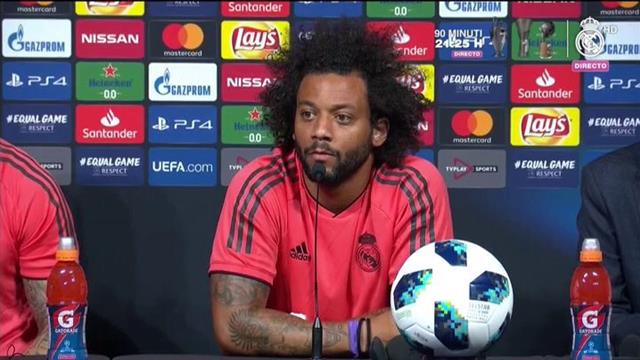 ظهر البرازيلي مارسيلو، نجم ريال مدريد الإسباني في مؤتمر صحفي للحديث عن مباراة الغد أمام أتليتكو مدريد، بكأس السوبر الأوروبي.