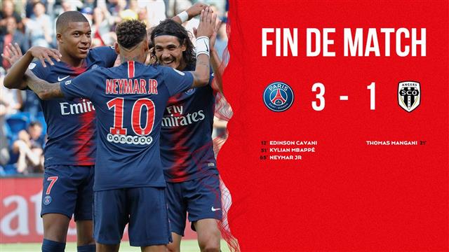 قاد الثلاثي إدينسون كافاني، نيمار دا سيلفا، وكيليان مبابي، فريقهم باريس سان جيرمان، لتحقيق الفوز الثالث في مشوارهم بالدوري الفرنسي، على حساب أنجيه.