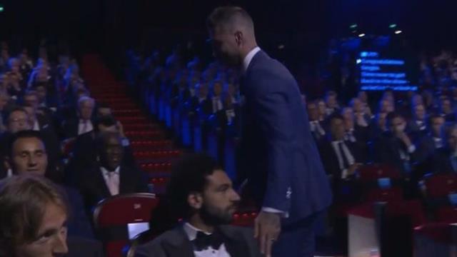 وظهر راموس في الحفل بعد استلاكه جائزة أفضل مدافع في أوروبا، وخلال توجهه للمقعد المخصص له وضع يده على "كتف" صلاح، الأمر الذي أثار جدلاً على مواقع التواصل الاجتماعي ولفت أنظار الإعلام.