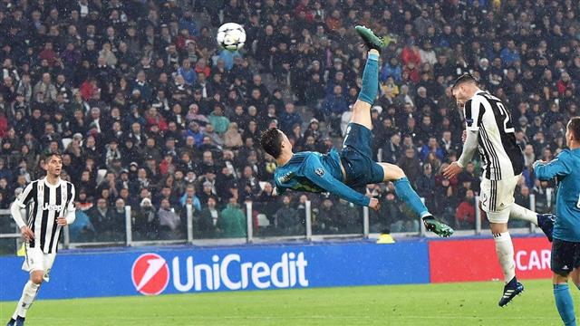 كريستيانو قفز وسط مدافعي يوفنتوس، ليضرب الكرة بخلفية مزدوجة تسكن مرمى بوفون، الذي يشاهد الكرة مثلما يشاهدها الجميع.