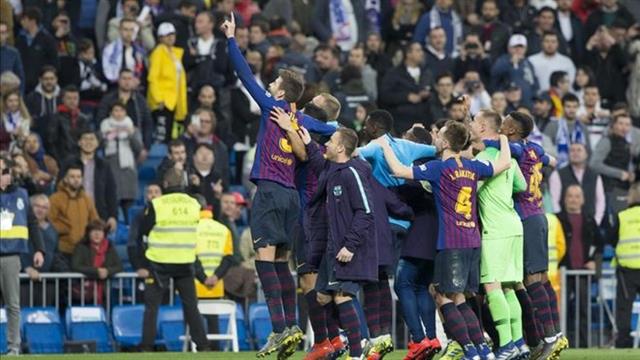 احتفل لاعبو فريق برشلونة مع جماهيرهم على ملعب "سانتياجو برنابيو"، معقل الغريم ريال مدريد، بعد الفوز في الكلاسيكو بالليجا، أمس السبت.