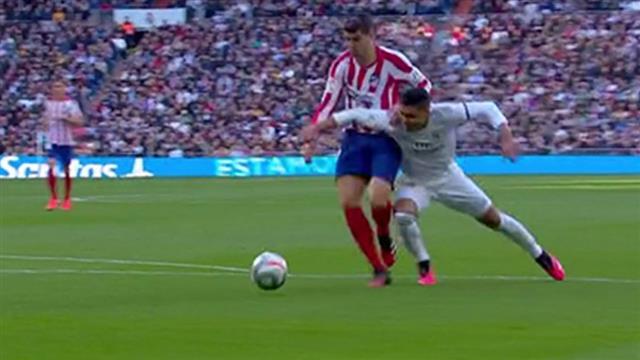وفي الدقيقة 33، سقط الإسباني ألفارو موراتا، مُهاجم الأتلتي في منطقة جزاء ريال مدريد، بعد التحام مع كاسيميرو، ولكن حكم المباراة لم يحتسب شيء.