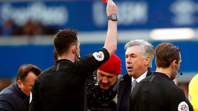 إيقاف أنشيلوتي وتغريمه ماليًا بعد اعتراضه على حكم مباراة إيفرتون ومانشستر يونايتد