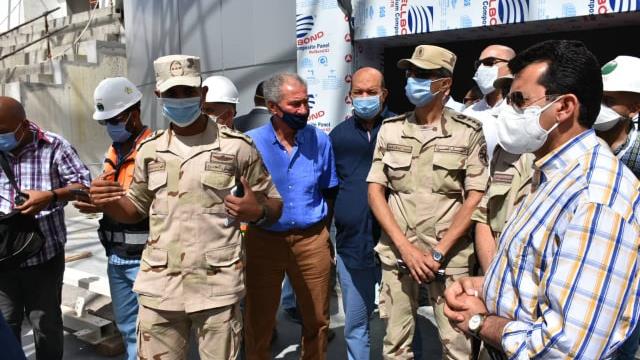 وتوجه وزير الشباب والرياضة ورئيس الاتحاد الدولي لكرة اليد لمواقع تنفيذ المكونات الإنشائية بالصالة المغطاة ببرج العرب والتي تتنوع ما بين الصالة الرئيسية مغطاه بسقف معدني، وملاعب الإحماء، وغرف اللاعبين والأجهزة الفنية، وغرفة للجنة المنظمة، ونادي صحي، وقاعة المؤتمرات، والمركز الإعلامي، بالإضافة إلى تفقد الموقع العام للصالة، والمرور بالبوابات الرئيسية والفرعية.