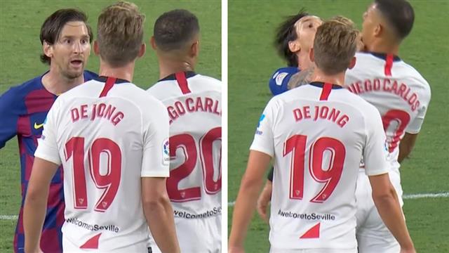 وقام ميسي بدفع كارلوس، ليسقط لاعب إشبيلية أرضًا، وتبدأ مشادة بين البرازيلي والأرجنتيني ويتجمع لاعبو الفريقين في مشادة.