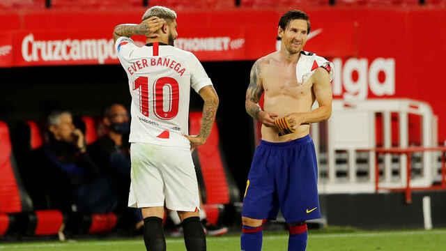 والتقطت الكاميرات بعد نهاية المباراة، حديثًا دار بين ميسي ومواطنه إيفر بانيجا لاعب وسط إشبيلية ولم يكن يرتدي مهاجم برشلونة قميصه بعد استبداله مع أحد لاعبي المنافس، بحسب صحيفة "El Espanol".
