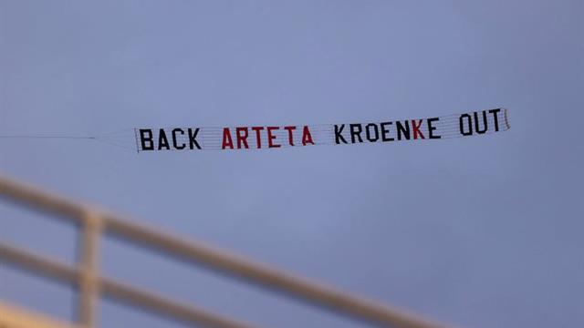 وظهرت لافتة، في مباراة الأمس بين آرسنال وأستون فيلا، كُتب عليها "الدعم لـ أرتيتا، ليرحل كرونكي".