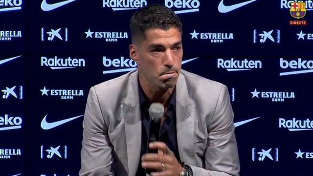 وبدأ سواريز حديثه "باكيًا" ولم يتمالك نفسه حتى انهمرت دموعه في المؤتمر الصحفي، وقال: "الأمر صعب جدًا، لكني أريد أن أشكر النادي الذي وثق بي وتعاقد معي بعد خطأ ارتكبته قبل التوقيع على العقد (عض كيليني في كأس العالم وإيقافه 4 أشهر)".