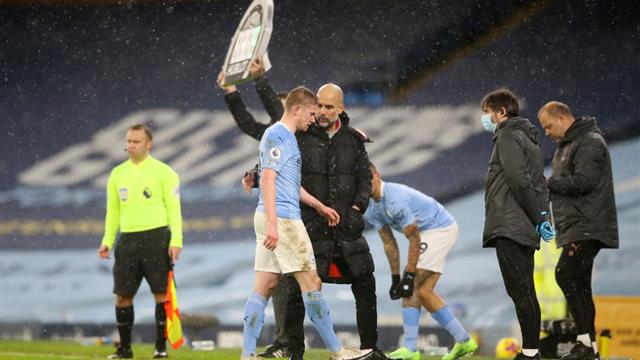 واضطر جوارديولا إلى إجراء تبديلين للإصابة حيث خرج كايل ووكر في الدقيقة 28 ثم خرج دي بروين في الدقيقة 59.