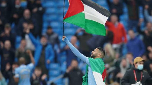 حرص الجزائري رياض محرز، نجم مانشستر سيتي، على رفع علم فلسطين أثناء مراسم تتويج فريقه بلقب الدوري الإنجليزي الممتاز "البريميرليج".