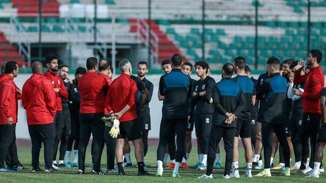 عقد بيتسو موسيماني، المدير الفني للفريق الأول لكرة القدم بالنادي الأهلي، محاضرة مع اللاعبين قبل انطلاق المران الثاني للفريق.