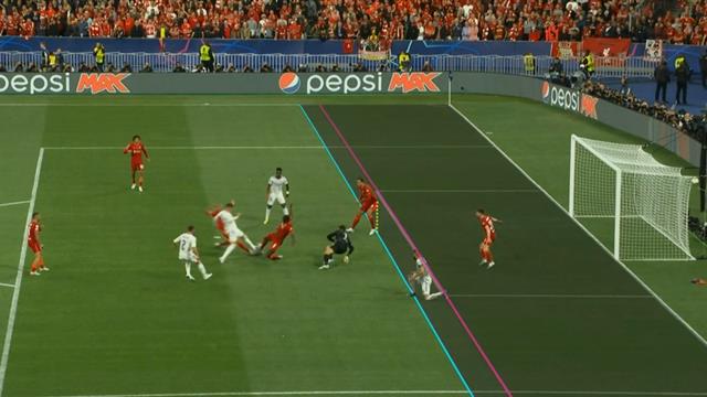 الهدف جاء بعد تمريرة وصلت إلى بنزيما داخل منطقة الجزاء، ثم حاول فيدي فالفيردي تسديد الكرة، إلا أن دفاع ليفربول تدخل عليه، ليسقط أرضًا، ثم تعود إلى بنزيما ويسدد داخل الشباك.