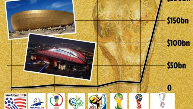 في كأس العالم 2006، أنفقت ألمانيا 4.3 مليار يورو، فيما كانت تكلفة مونديال كوريا واليابان في 2002، 7 مليارات يورو، وقبلها بأربع سنوات أنفقت فرنسا في 1998، 2.3 مليار يورو، وأخيرًا الولايات المتحدة الأمريكية، التي أنفقت نصف مليار يورو فقط في 1994.