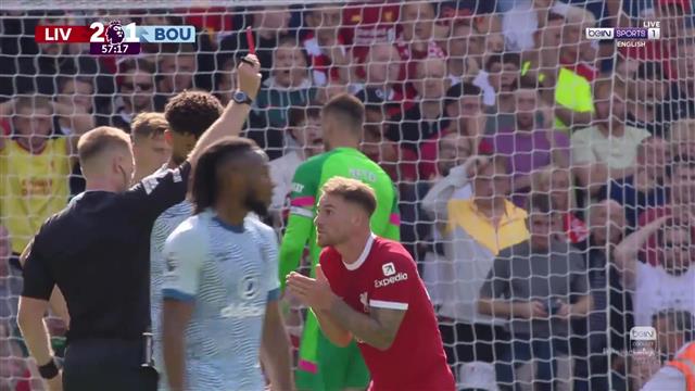 وتدخل أليستر على كريستي لاعب بورنموث، وذهب حكم المباراة وأشهر البطاقة الحمراء للاعب ليفربول في الدقيقة 57.