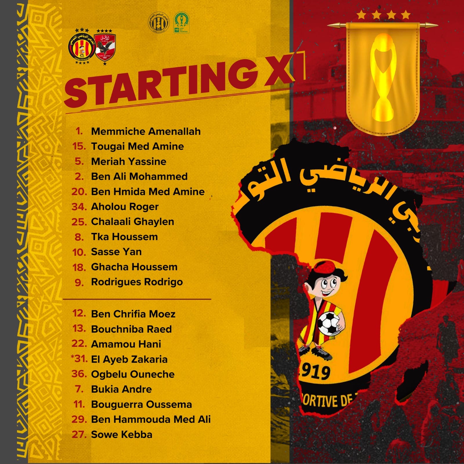 التشكيلة الأساسية للترجي الرياضي التونسي في مواجهة الأهلي المصري