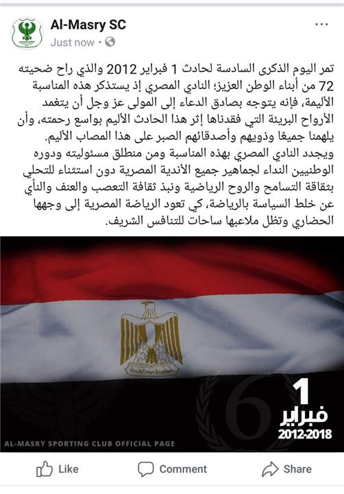 تمر اليوم الذكرى السادسة لحادث 1 فبراير 2012 والذي راح ضحيته 72 من أبناء الوطن العزيز؛ النادي المصري إذ يستذكر هذه المناسبة الأليمة، فإنه يتوجه بصادق الدعاء إلى المولى عز وجل أن يتغمد الأرواح البريئة التي فقدناها إثر هذا الحادث الأليم بواسع رحمته، وأن يلهمنا جميعًا وذويهم وأصدقائهم الصبر على هذا المصاب الأليم.