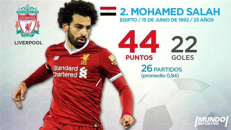 ويأتي الأرجنتيني سيرجيو أجويرو، مهاجم مانشستر سيتي الإنجليزي، في المرتبة الثالثة برصيد 42 نقطة، بعد تسجيل 21 هدفا، بالتساوي مع إيدنسون كافاني، لاعب باريس سان جيرمان الفرنسي.