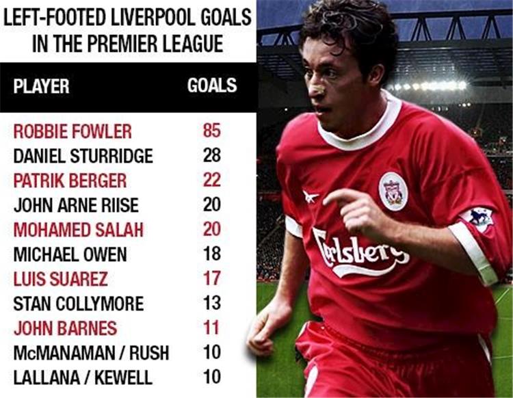 ويتواجد في المركز الأول "روبي فاولر" الذي سجل 85 هدفًا بالقدم اليسرى، ويليه "دانييل ستوريدج" بـ28 هدفًا، ثم "باتريك بيرغر" بـ22 هدفًا.