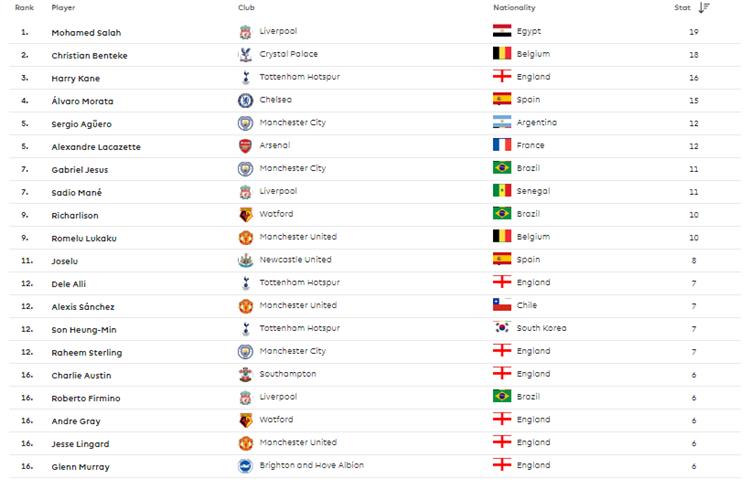 ويأتي في المركز الثاني لاعب كريستال بالاس " كريستيان بنتيكي" بـ18 فرصة، بينما جاء لاعب توتنهام "هاري كين" في المركز الثالث بـ16 فرصة، ويليه لاعب تشيلسي "ألفارو موراتا" بـ15 هدفًا.