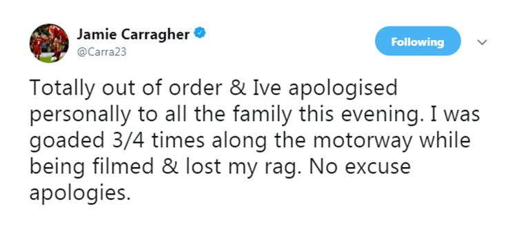 واضطر "كاراجر" إلى الاعتذار بعد ذلك على حسابه الشخصي بموقع تويتر، حيث قال:" اعتذر شخصيًا لجميع أفراد تلك الأسرة، لقد تعرضت للاستفزاز ثلاث أو أربع مرات طوال الطريق ".