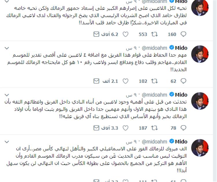 وقال ميدو عبر حسابه الخاص علي مواقع التواصل الاجتماعي "تويتر": "ألف مبروك للزمالك الفوز على الإسماعيلي الكبير والتأهل لنهائي كأس مصر، أرى أن التوقيت ليس مناسبا للحديث عّن من سيكون مدرب الزمالك الموسم المقبل والأهم هو التركيز من الجميع للحصول على بطولة الكأس حيث إن النهائي لن يكون سهلاً أبدا".