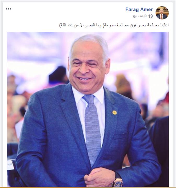 وكتب عامر عبر صفحته الشخصية على موقع التواصل الاجتماعي "فيس بوك": "أعلينا مصلحة مصر فوق مصلحة سموحة (وما النصر إلا من عند الله)".