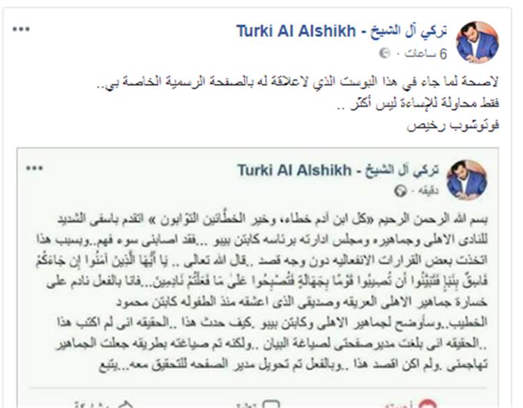 وكانت أحد الصفحات على موقع التواصل الاجتماعي "فيس بوك" نشرت تدوينة أعتذار بإسم تركي آل الشيخ لمجلس إدارة الأهلي.