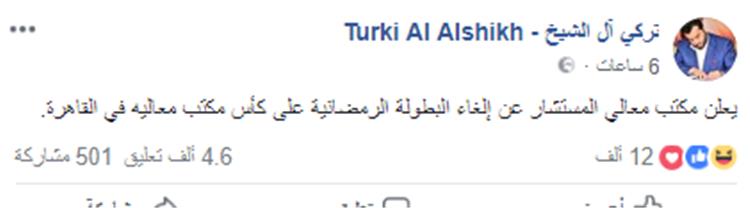 كما أعلن آل الشيخ، عن إلغاء البطولة الرمضانية المقرر لها في القاهرة، تحت اسمه.