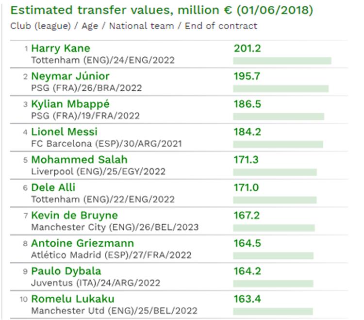 وحل لاعب برشلونة "ليونيل ميسي" بعد ذلك ب،184.2 مليون يورو، ويليه المصري "محمد صلاح" في المركز الخامس بـ171.3 مليون يورو.