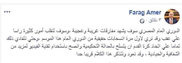 وقال عامر على حسابه الخاص بموقع التواصل الاجتماعي "فيس بوك": "الدوري العام المصري سوف يشهد مفارقات غريبة وعجيبة، وسوف تنقلب أمورًا كثيرة رأسًا على عقب".