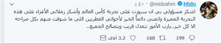 وقال ميدو على حسابه الخاص بموقع التواصل الاجتماعي"تويتر": "تجربه جديدة في قناة بيراميدز وبرنامج عالمي مع أساطير البريميرليغ ونجوم الدوريات الإوروبية من مراكز التدريب".