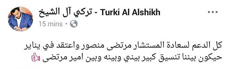 وقال تركي آل الشيخ في تدوينة له عبر صفحته الرسمية بموقع التواصل الاجتماعي "فيس بوك": "كل الدعم لسعادة المستشار مرتضى منصور".