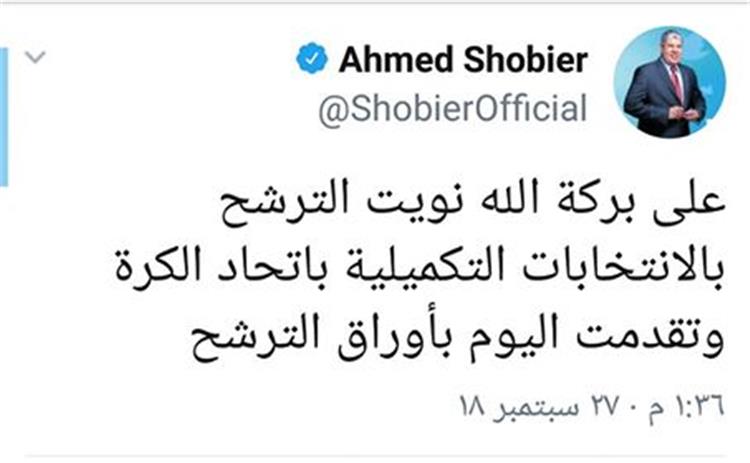 وكتب شوبير عبر صفحته الشخصية على موقع التواصل الاجتماعي تويتر :"على بركة الله نويت الترشح بالانتخابات التكميلية باتحاد الكرة وتقدمت اليوم بأوراق الترشح".