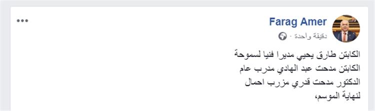 ونشر فرج عامر عبر حسابه الخاص بموقع التواصل الاجتماعي "فيس بوك" تشكيل الجهاز الفني الجديد: "طارق يحيي مديرًا فنيًا لسموحة، مدحت عبد الهادي مدرب عام، الدكتور مدحت قدري مدرب أحمال حتي نهاية الموسم الحالي".
