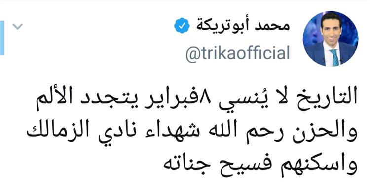 نشر أبو تريكة، عبر حسابه الرسمي على موقع التواصل الاجتماعي " فيس بوك ": "التاريخ لا يُنسى 8 فبراير يتجدد الألم والحزن رحم الله شهداء نادي الزمالك واسكنهم فسيح جناته".