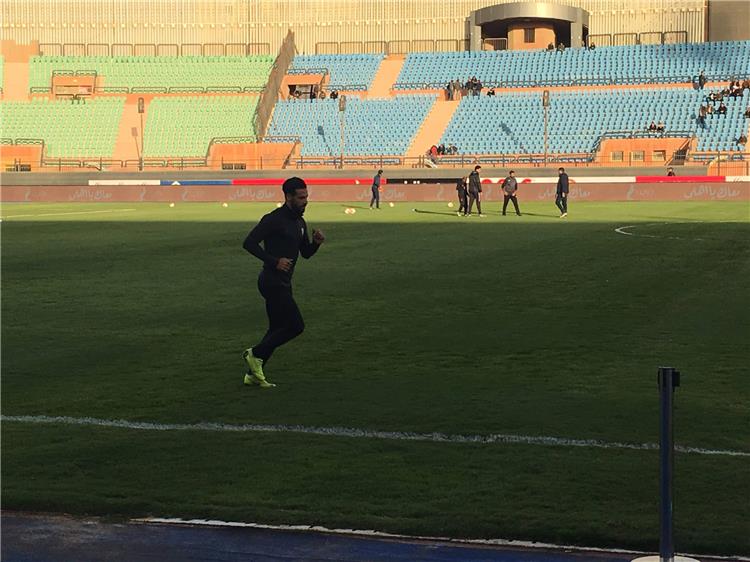 ويؤدي محارب تدريبات تأهيلية بالجري حول الملعب قبل انطلاق المباراة المرتقبة.