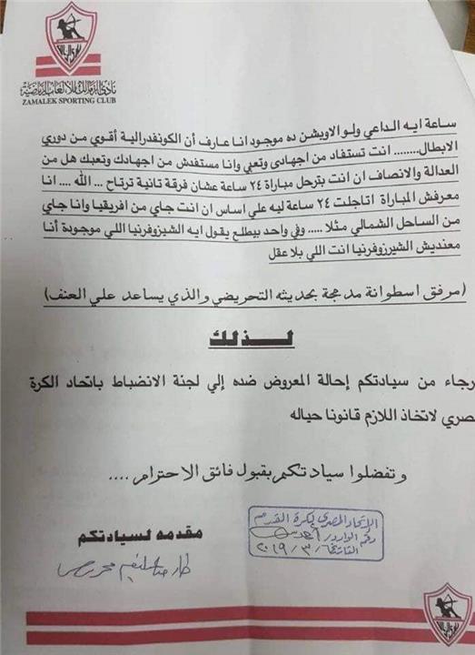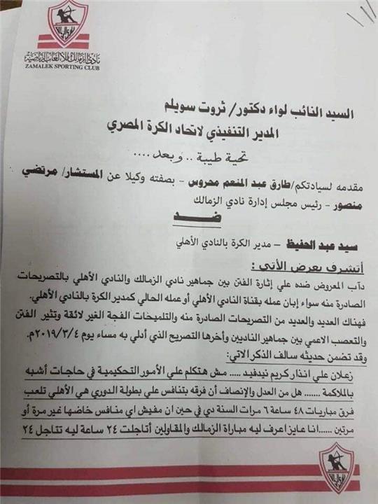 وطالب خطاب نادي الزمالك إحالة سيد عبدالحفيظ إلى لجنة الانضباط باتحاد الكرة من أجل اتخاذ اللازم قانونًا حياله حسبما أوضح الخطاب.