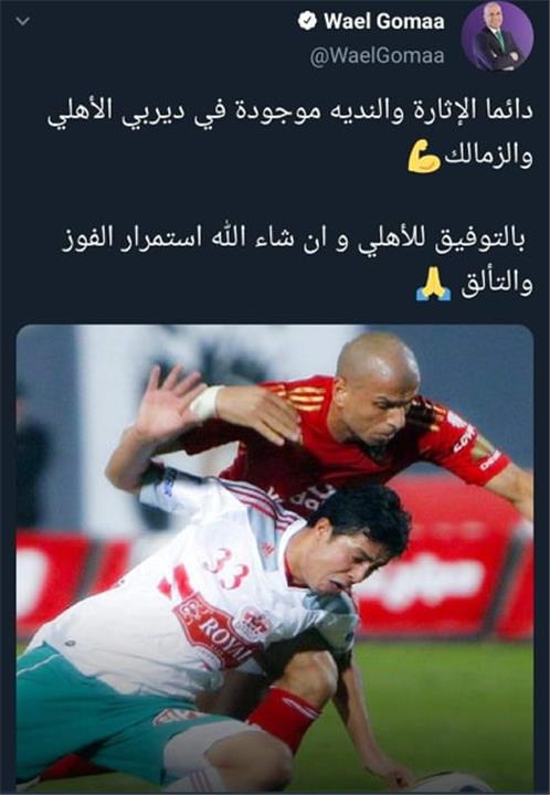 وقال المدافع الدولي في تدوينة له عبر موقع التواصل الاجتماعي "تويتر": "دائمًًا الإثارة والندية موجودة في ديربي الأهلي والزمالك".