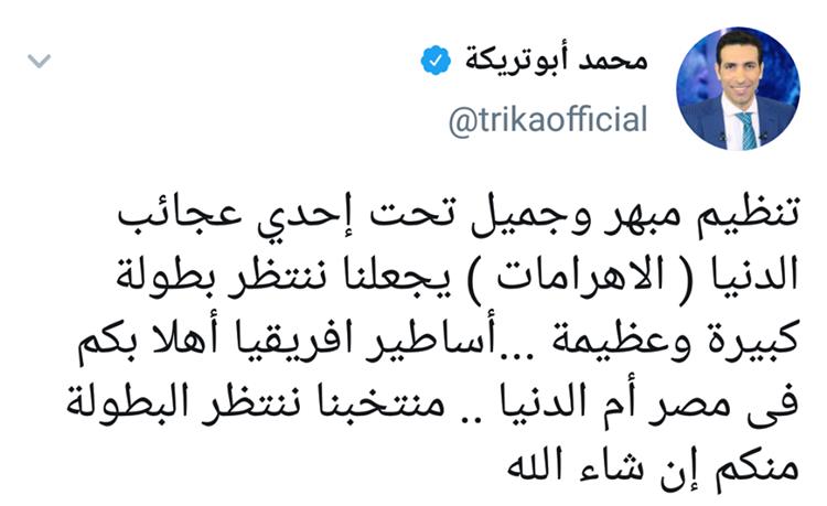 وتابع: "تنظيم يجعلنا ننتظر بطولة كبيرة وعظيمة، أساطير إفريقيا أهلًا بكم في مصر أم الدنيا".