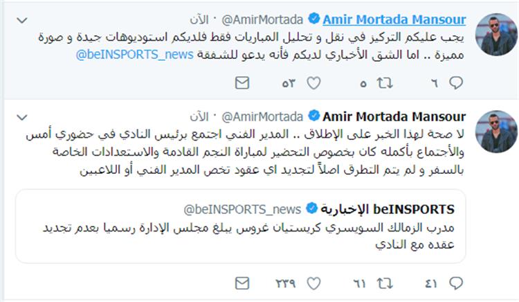 وقال أمير علي حسابه الخاص بموقع التواصل الاجتماعي "تويتر": "لا صحة لهذا الخبر على الإطلاق، المدير الفني اجتمع برئيس النادي في حضوري أمس والاجتماع بأكمله كان بخصوص التحضير لمباراة النجم القادمة والاستعدادات الخاصة بالسفر و لم يتم التطرق اصلاً لتجديد اي عقود تخص المدير الفني أو اللاعبين".