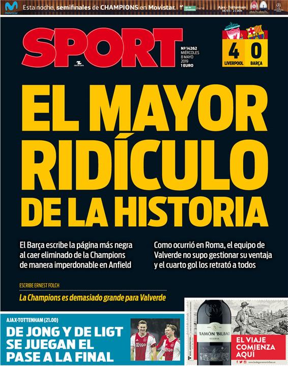 خرجت الصحافة الكتالونية لتعبر بقسوة عن السقوط المهين لبرشلونة أمام ليفربول في مباراة الإياب بنصف نهائي دوري أبطال أوروبا.