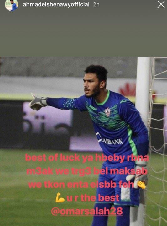 وقال الشناوي عبر حالته الخاصة بحسابه الرسمي على موقع الصور الشهير "إنستجرام"، موجهًا حديثه إلى عمر صلاح: "حظ جيد يا حبيبي، ربنا معك وتعود بالفوز وتكون أنت السبب فيه".