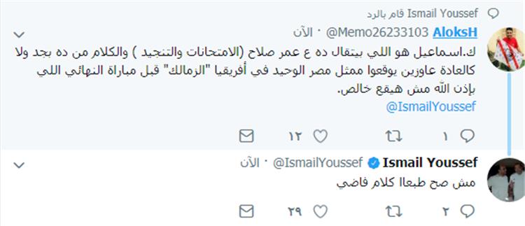 وقال يوسف علي حسابه الخاص بموقع التواصل الاجتماعي "تويتر" ردا علي أحد المتابعين بعدم سفر عمر صلاح لارتباطه بالامتحانات أو التجنيد: "مش صح طبعا كلام فاضي" في أشارة منه إلي تواجد الحارس في المباراة.