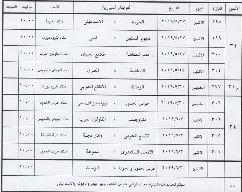 مواعيد الجولة الـ34 والأخيرة من الدوري المصري الممتاز علي النحو التالي: