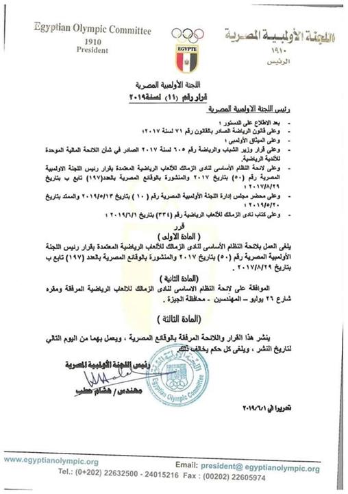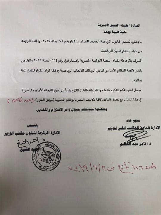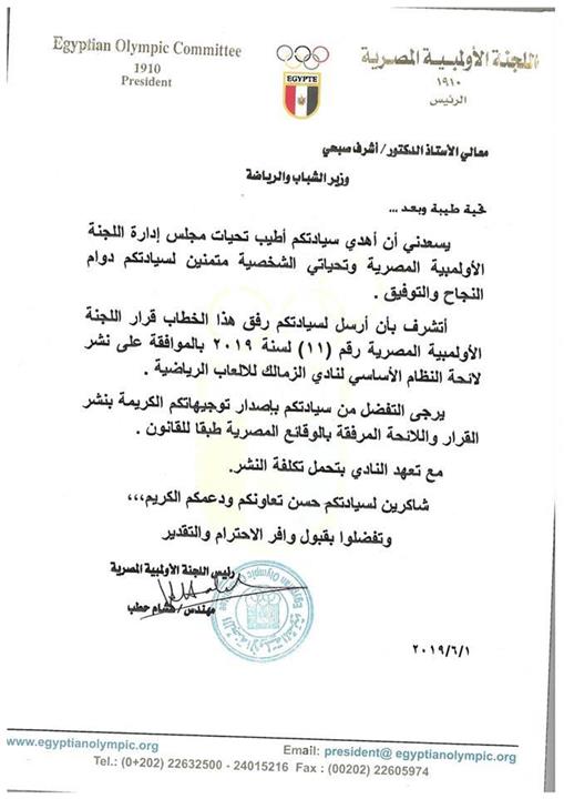 وتضمن المستند الثاني، خطابًا من اللجنة الأولمبية، إلى أشرف صبحى، وزير الشباب والرياضة، من أجل الموافقة على قرار اللجنة الأولمبية، رقم ” 11 ” لسنه 2019 ، باعتماد الجمعية العمومية العادية وغير العادية للزمالك، ولائحة النادي الجديدة، من أجل نشرها في جريدة الوقائع المصرية.