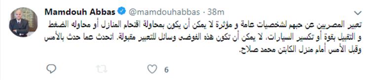 وقال عباس عبر صفحته الرسمية بموقع التغريدات القصيرة "تويتر": "تعبير المصريين عن حبهم لشخصيات عامة ومؤثرة لا يمكن أن يكون بمحاولة اقتحام المنازل أو محاوله الضغط والتقبيل بقوة أو تكسير السيارات".