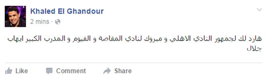 وكتب بندق فى تدوينه له عبر حسابه على "فيس بوك": "هارد لك لجمهور النادى الاهلى ومبروك لنادى المقاصة والفيوم والمدرب الكبير إيهاب جلال".