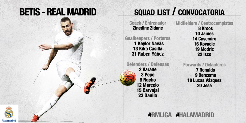 وأعلن المدير الفني للمرينجي، زين الدين زيدان، قائمة الفريق المستدعاة التي ضمت 19 لاعبا، ويغيب الويلزي، جاريث بيل، عن قائمة الفريق للإصابة في العضلة النعلية للقدم اليمنى، وأيضا قائد الفريق، راموس.