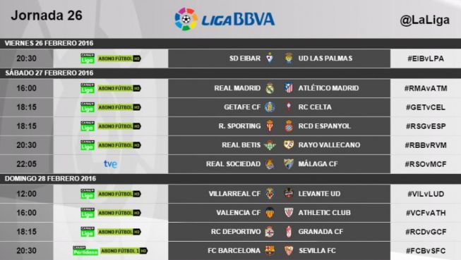 أعلن الاتحاد الإسباني لكرة القدم عن مواعيد الجولة الـ 26 من الليجا الإسبانية التي ستشهد مواجهة بين برشلونة وإشبيلية، وديربي مدريد بين " ريال مدريد وأتليتكو مدريد."