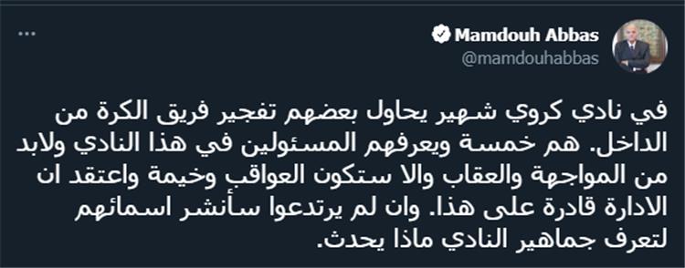 وكتب ممدوح عباس عبر حسابه الشخصي بموقع التواصل الاجتماعي "تويتر": "في ناد كروي شهير، يحاول بعضهم تفجير فريق الكرة من الداخل، هم خمسة أشخاص، يعرفهم المسؤولون في هذا النادي".